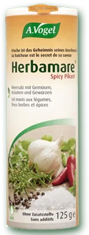 A.Vogel Herbamare Spicy sol je zeliščna sol, pripravljena po posebnem postopku, v katerem se fino mletim kristalom morske soli primešajo sveže začimbe in zelenjava, ki nato skupaj zorijo v sodih in se vakuumsko posušijo, da pridobijo posebno aromo. Od Herbamare Original soli se razlikuje po dveh sestavinah - čiliju in popru, zaradi česar je pikantna. Izdelek je veganski.