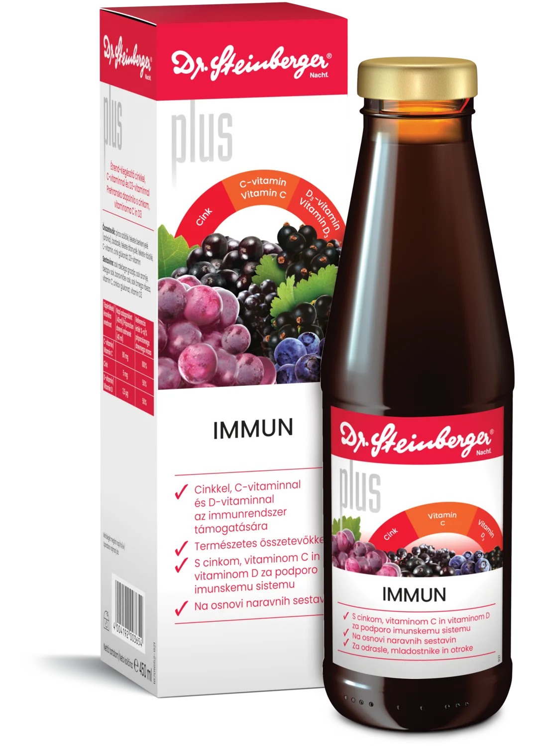 Zadostna oskrba telesa s pomembnimi hranili, vitamini in minerali, je bistvenega pomena za normalno delovanje imunskega sistema. Dr Steinberger Immun plus tonik podpira normalno delovanje imunskega sistema na tri načine: s cinkom ter vitaminoma C in D3. Ker telo ne more samo proizvajati cinka, moramo ta vitalni element zaužiti v zadostnih količinah s hrano, kar pa velja tudi za vitamin C. Nasprotno velja za vitamin D3, ki ga telo lahko proizvaja samo, če smo v zadostni meri izpostavljeni sončni svetlobi. S prehrano ga je smiselno dodajati predvsem v zimskih mesecih, ko nam sončne svetlobe primanjkuje in pa ob zmanjšani imunski odpornosti. Prednost tonika Dr Steinberger Immun plus je zagotovo njegov dober, sadni okus, ki temelji na sokovih rdečega grozdja, borovnic, jagod aronije, črnega ribeza in bezga. Ne vsebuje glutena in je primerne za vegane. Brez alkohola, laktoze in glutena. Brez dodanih konzervansov, barvil, sladil ali arom