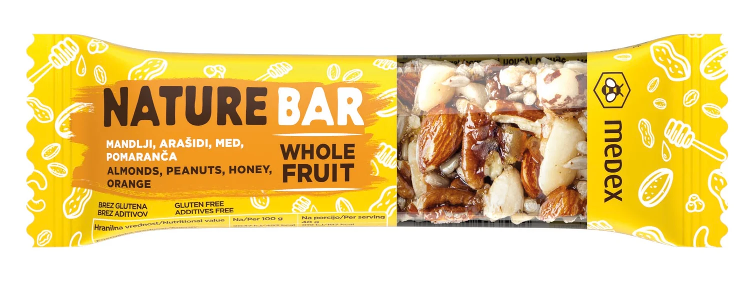 Medex Nature bar pomaranča je naravna energijska ploščica iz oreščkov, suhega sadja in medu, obogatena z naravno aromo pomaranče. Ne vsebuje glutena, aditivov ali umetnih dodatkov. Namenjena je vsem, ki iščejo hiter in zdrav vir energije, zlasti pri telesni aktivnosti, na poti, med učenjem ali kot naraven prigrizek. Ploščica je praktična, okusna in primerna tudi za šolarje in aktivne posameznike, ki želijo energijo nadomestiti na naraven način.