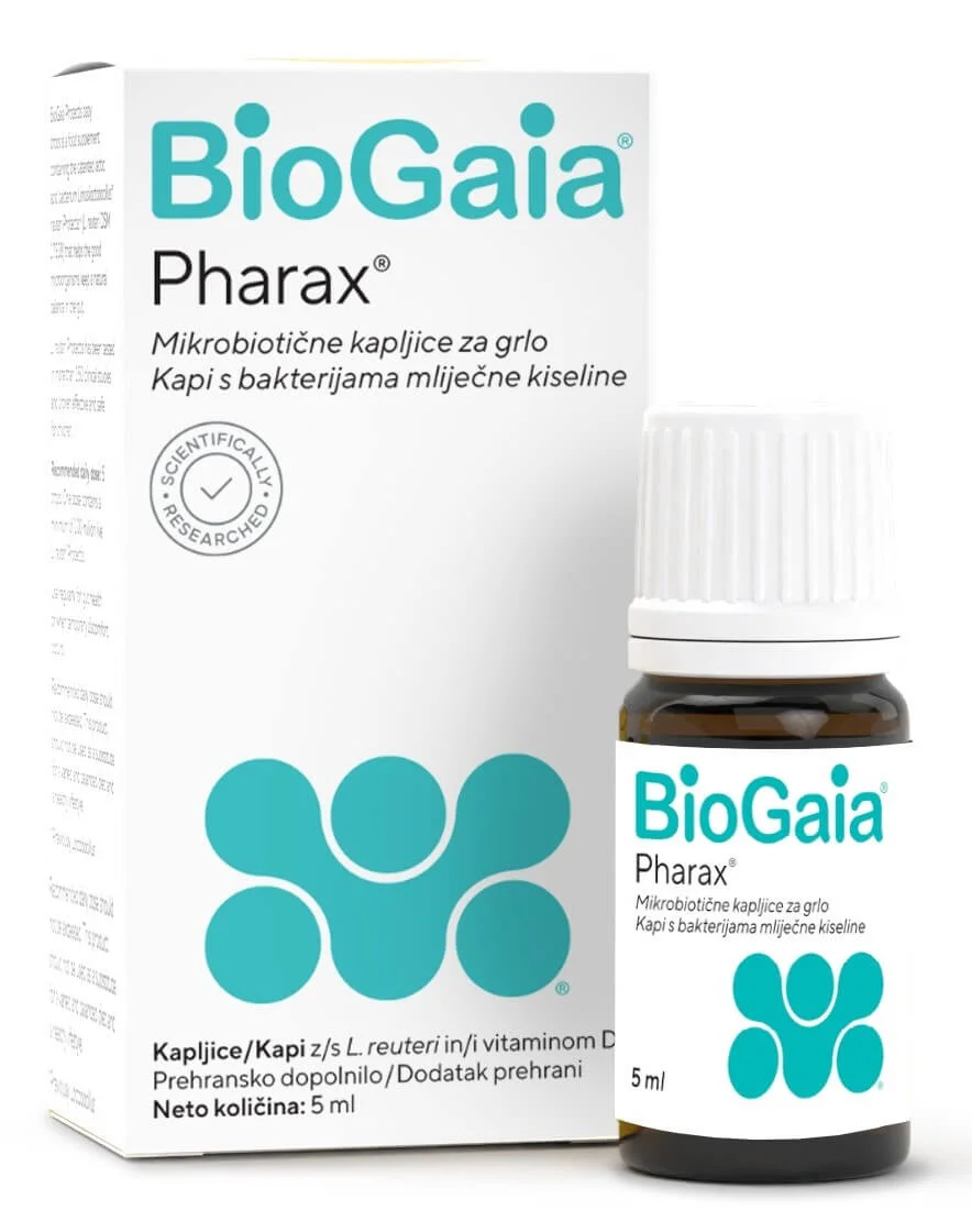 BioGaia Pharax mikrobiotične kapljice za grlo so prehransko dopolnilo, ki vsebuje klinično preizkušene seve Limosilactobacillus reuteri in vitamin D3. Namenjene so podpiranju zdrave ustne mikrobiote in imunskega sistema. Primerne so za otroke nad 6 mesecev ter odrasle.