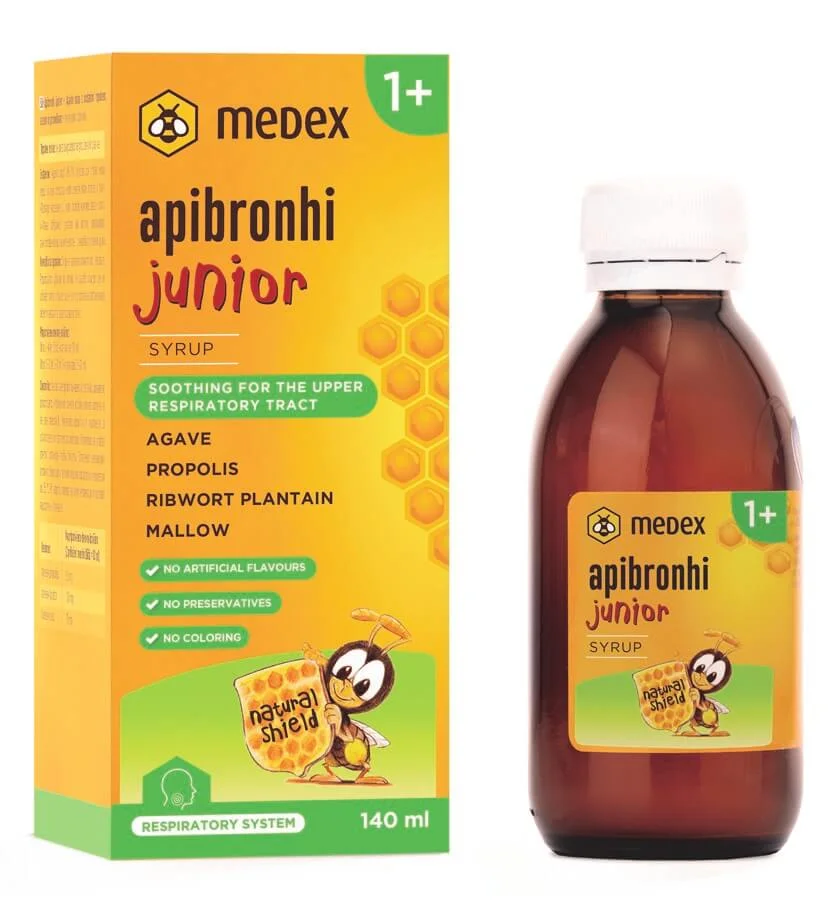 Medex Apibronhi Junior otroški sirup ima učinkovito kombinacijo naravnih sestavin (propolis, trpotec, slez). Primeren je za otroke že od 1. leta starosti dalje. Uživajo ga lahko tudi nosečnice, doječe matere in mladostniki ter odrasli. Je 100 % naraven, brez konzervansov, sladil, barvil, arom in drugih umetnih dodatkov.