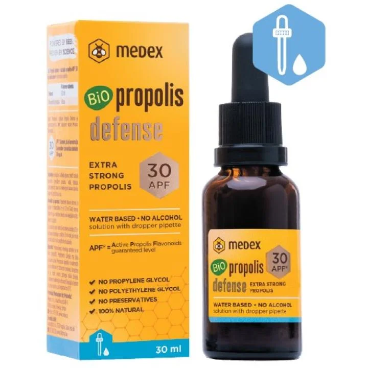 Medex BIO Propolis Defense APF30 je naravna raztopina na vodni osnovi, ki vsebuje tekoči izvleček propolisa iz ekološke pridelave. Gre za prehransko dopolnilo, primerno tudi za otroke od 3. leta dalje, brez alkohola, konzervansov, propilen glikola in polietilen glikola.