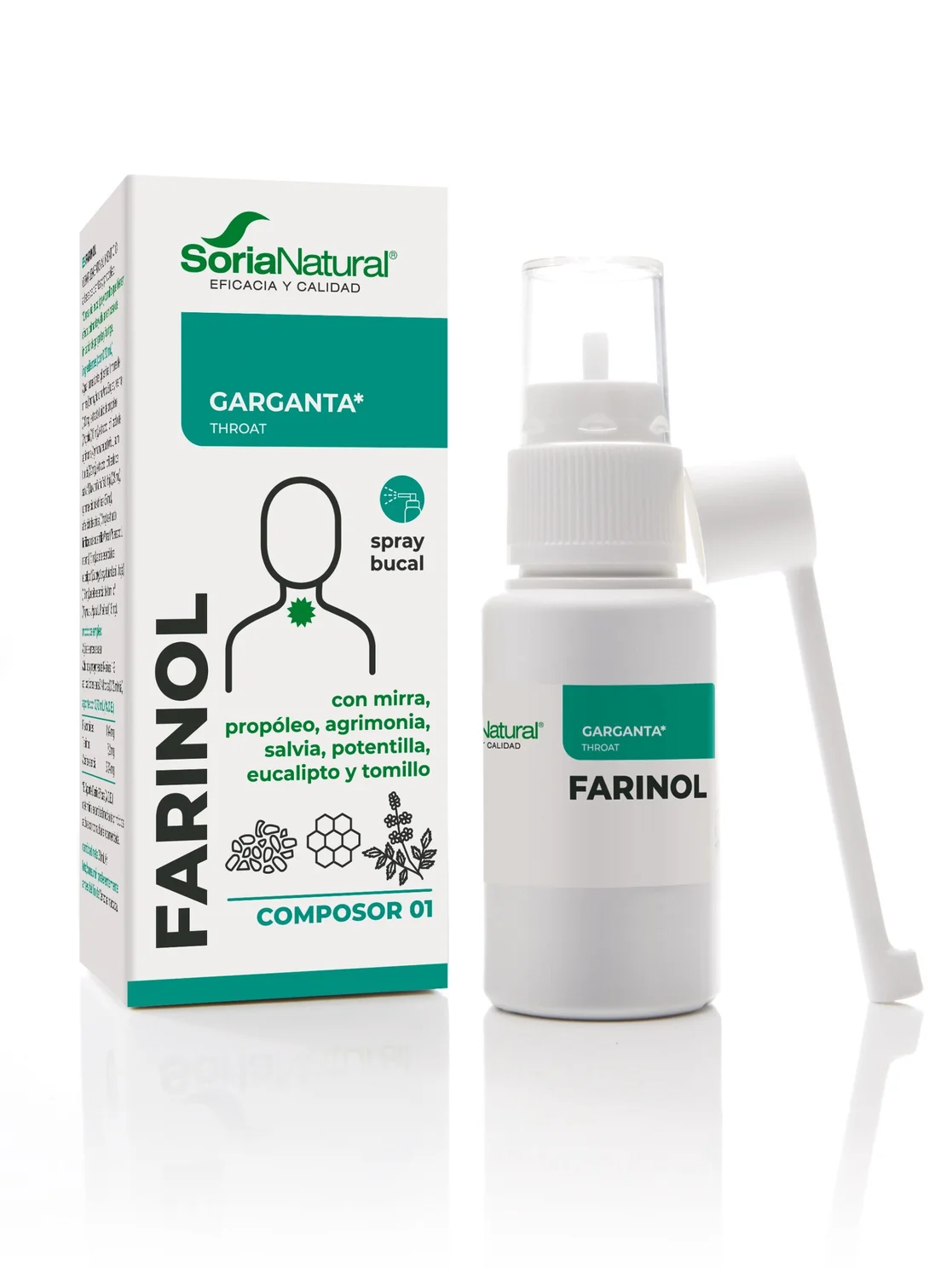 Soria Natural Farinol kompleks XXI pršilo za grlo je prehransko dopolnilo s kombinacijo zdravilnih rastlin, ki na naraven način blažijo draženje, bolečino in vnetje v ustih in grlu ter podpirajo zdravje ustne votline. Izdelek je primeren za uporabo pri odraslih, starostnikih in mladostnikih, starejših od 14 let.