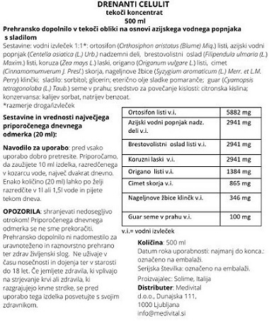 Solime Koncentrat drenanti proti celulitu z ortosifonom in azijskim vodnim popnjakom je prehransko dopolnilo, ki pomaga pri naravnem odvajanju telesnih tekočin in podpira zmanjševanje videza celulita, za občutek lahkotnejših in bolj negovanih nog.