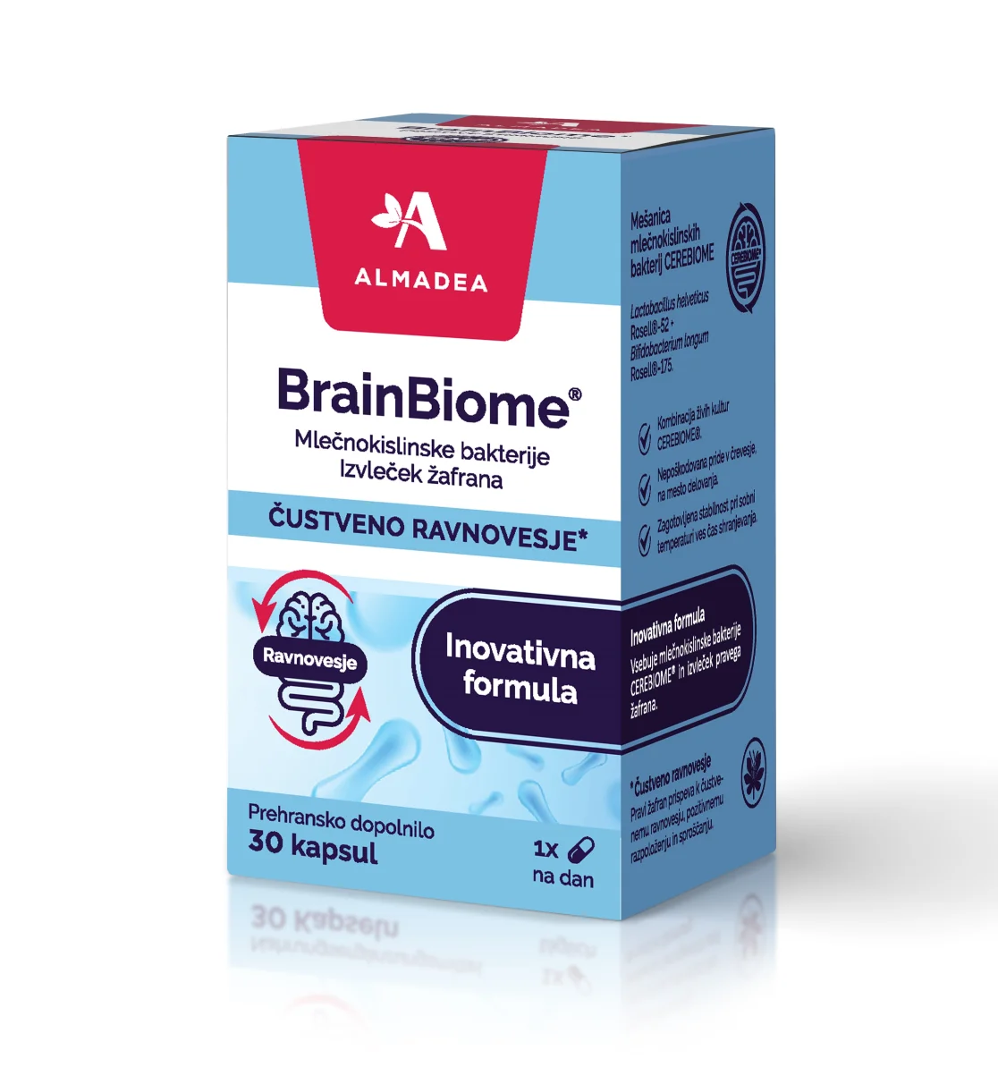 BrainBiome je inovativen prehranski dodatek, ki pomaga pri psihičnemu stresu, nemiru, razdražljivosti, preobremenjenosti, težavah s spanjem in razdražljivemu črevesju. S posebej izbrano formulo mlečnokislinskih bakterij cerebiome in izvlečkom žafrana ohranja zdravo črevesno mikrobioto, kar prispeva k izboljšanemu čustvenem ravnovesju.