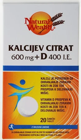 Natural Wealth, Kalcijev citrat 600 mg + D 400 I.E., 20 šumečih tablet