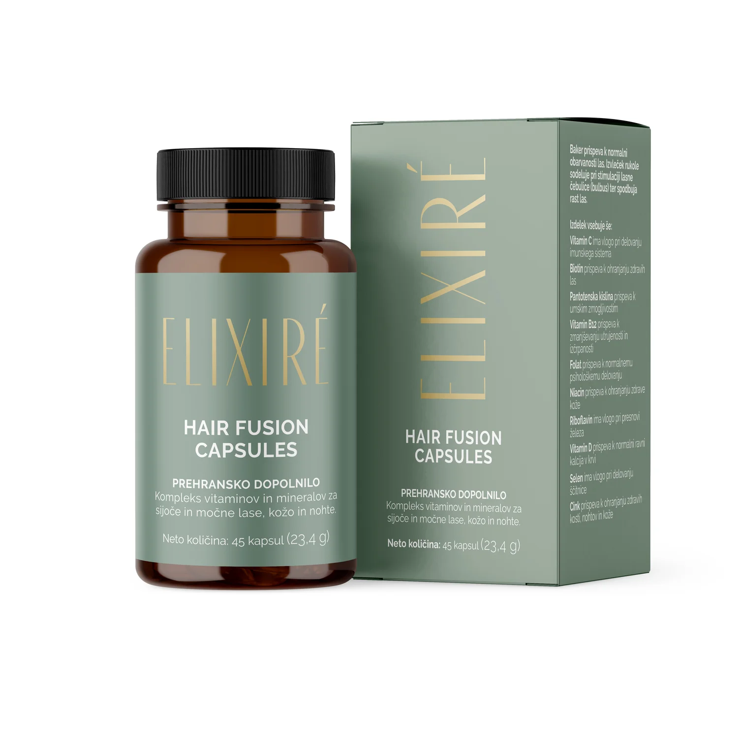 Elixiré Hair Fusion je prehransko dopolnilo v kapsulah, namenjeno celostni podpori zdravju las, kože in nohtov. Gre za izdelek z napredno formulo, ki združuje vitamine, minerale, rastlinske izvlečke in hialuronsko kislino ter prispeva k ohranjanju naravne lepote od znotraj navzven.