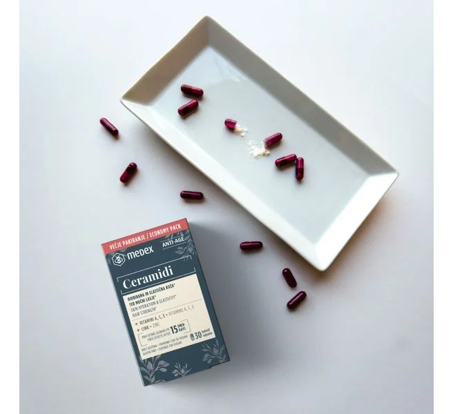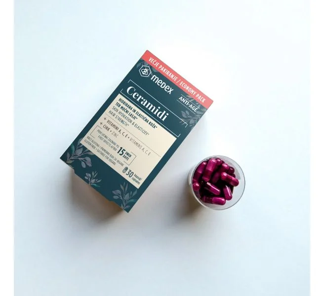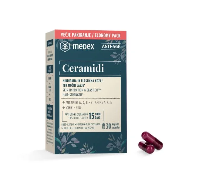 Medex Ceramidi so prehransko dopolnilo v kapsulah, namenjeno podpiranju hidracije, elastičnosti in splošnega videza kože ter krepitvi las od znotraj navzven. Formula temelji na naravnih učinkovinah, ki pomagajo obnoviti kožno bariero in podpreti zdrav ter sijoč videz kože in močnejše lase. Izdelek je primeren za vse, ki želijo izboljšati stanje kože ali zmanjšati lomljenje in izpadanje las.