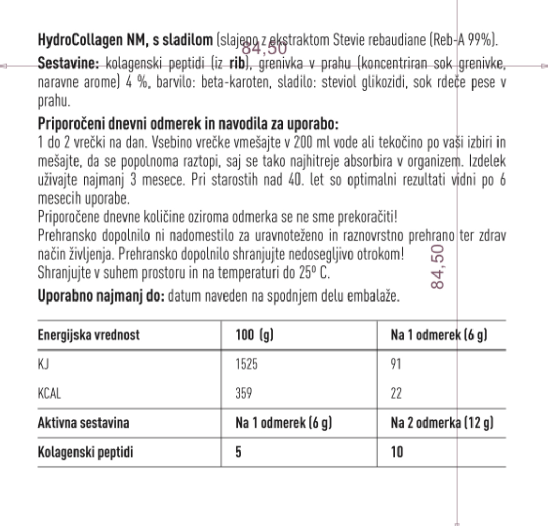 Kolagenski peptidi (iz rib), grenivka v prahu (koncentriran sok grenivke, naravne arome), barvilo: beta-karoten, sladilo: steviol glikozidi, sok rdeče pese v prahu.