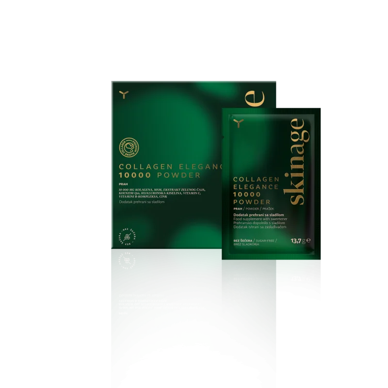 Yasenka Skinage Collagen Elegance 10000 je prehransko dopolnilo v prahu brez sladkorja, zasnovano za podporo lepoti, zdravju in energiji. Vsebuje visok odmerek hidroliziranega kolagena, MSM-ja, izvleček zelenega čaja, koencim Q10, hialuronsko kislino, cink ter vitamine C in B kompleksa. Primerno je za vsakodnevno uporabo doma ali na poti, saj ga lahko enostavno zmešate z vodo, sokom ali dodate v smoothie.