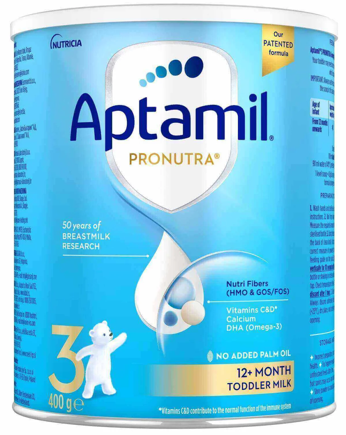 Aptamil 3 Pronutra je prehransko popolna formula, zasnovana na osnovi napredne tehnologije in patentirane mešanice prebiotičnih vlaknin. To mleko je obogateno z esencialnimi hranili, ki podpirajo rast, imunski sistem in razvoj dojenčkov po prvem letu starosti. Vsebuje ključne sestavine, ki so naravno prisotne tudi v materinem mleku, kar omogoča lažji prehod na raznoliko prehrano. Aptamil 3 je brez palmovega olja, vsebuje pa tudi vlaknine (GOS/FOS), ki pomagajo vzdrževati zdravo črevesno floro in prebavo. Primeren je za otroke od 10. meseca starosti.