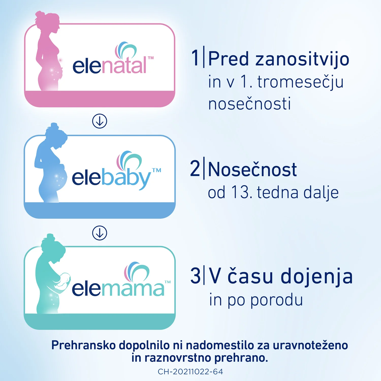 Elebaby kapsule so prehransko dopolnilo, posebej namenjeno nosečnicam od 13. tedna dalje. V eni kapsuli združujejo kombinacijo 18 vitaminov in mineralov ter omega-3 maščobne kisline, ki podpirajo materino telo in razvoj otroka v drugem in tretjem trimesečju nosečnosti. Vsebujejo tudi posebno obliko folne kisline z izboljšano biološko razpoložljivostjo.