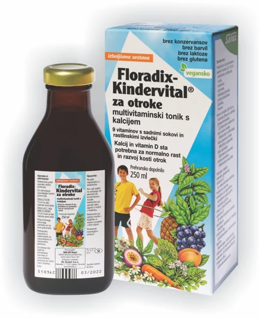 Floradix Kindervital je okusen multivitaminski tonik za otroke, ki z rastlinskimi izvlečki in sadnimi sokovi zagotavlja vir vitaminov in mineralov, potrebnih v razvojnem obdobju otroka. Vpliva na delovanje imunskega sistema in pravilno rast ter razvoj. Zaradi mešanice različnih sadnih koncentratov in zelišč je tonik prijetnega okusa, priljubljen pri otrocih.