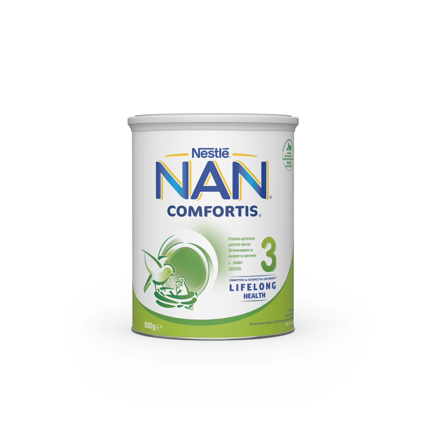 Strokovnjaki družbe Nestlé so razvili formulo NAN Comfortis 3 na podlagi dolgoletnih izkušenj iz preučevanja prehrane dojenčkov in majhnih otrok. Ima edinstveno sestavo beljakovin v skladu s starostjo otroka tako z vidika kakovosti kot količine.Lactobacillus reuteri* – podoben sev lahko najdemo v črevesni flori dojenih otrok. Vsebuje vlaknine - frukto-oligosaharide in galakto-oligosaharide. Vitamin D prispeva k normalnemu delovanju imunskega sistema pri otrocih. Kalcij je potreben za normalno rast in razvoj kosti pri otrocih. Raznovrstna in uravnotežena prehrana ter zdrav način življenja so pomembni za zdravje vašega otroka. Vprašajte zdravnika za več informacij o formuli NAN Comfortis 3.