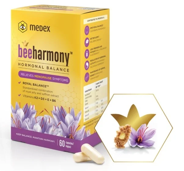 Beeharmony Medex kapsule so naravno prehransko dopolnilo, ki združuje inovativno mešanico sestavin, kot so matični mleček, žafran ter vitamini B6, E, D3 in K2, namenjeno podpori ženskega telesa v obdobju hormonskih sprememb. Zasnovane so posebej za pomoč pri lajšanju simptomov menopavze, predmenstrualnega sindroma (PMS) ter za spodbujanje hormonskega ravnovesja in splošnega dobrega počutja. Kapsule Beeharmony vsebujejo patentirano formulo Royal Balance, ki povezuje prednosti matičnega mlečka, žafrana in ključnih vitaminov, potrebnih za ohranjanje zdravja kosti, zaščito pred oksidativnim stresom ter boljši spanec.