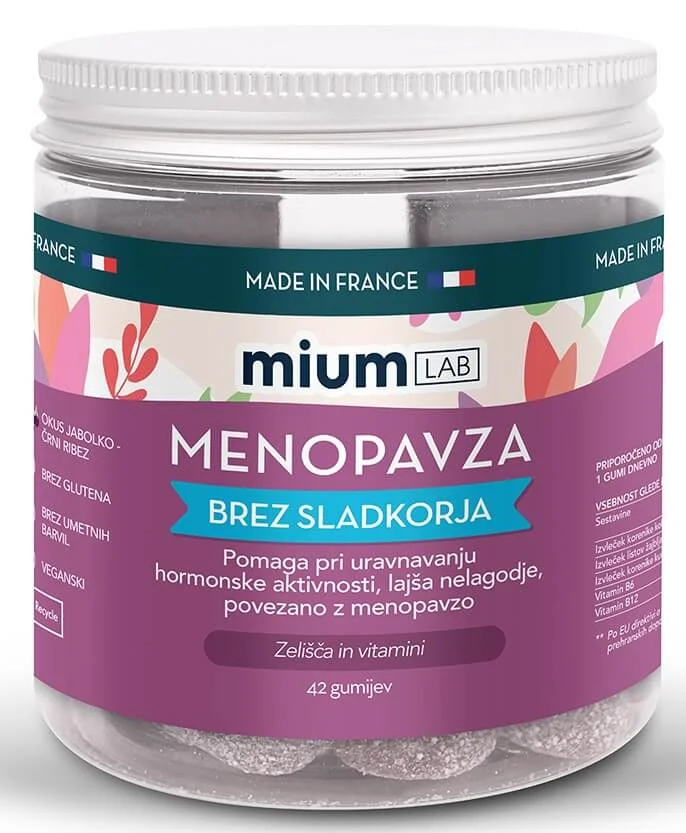 Mium Lab Menopavza gumiji so prehransko dopolnilo v obliki gumijev s prijetnim okusom jabolka in črnega ribeza, namenjeno ženskam v obdobju menopavze. Izdelek združuje zelišča in vitamine ter je zasnovan za podporo hormonskemu ravnovesju in lajšanje nelagodja v času menopavze. Gumiji so veganski, brez sladkorja, glutena in umetnih barvil.