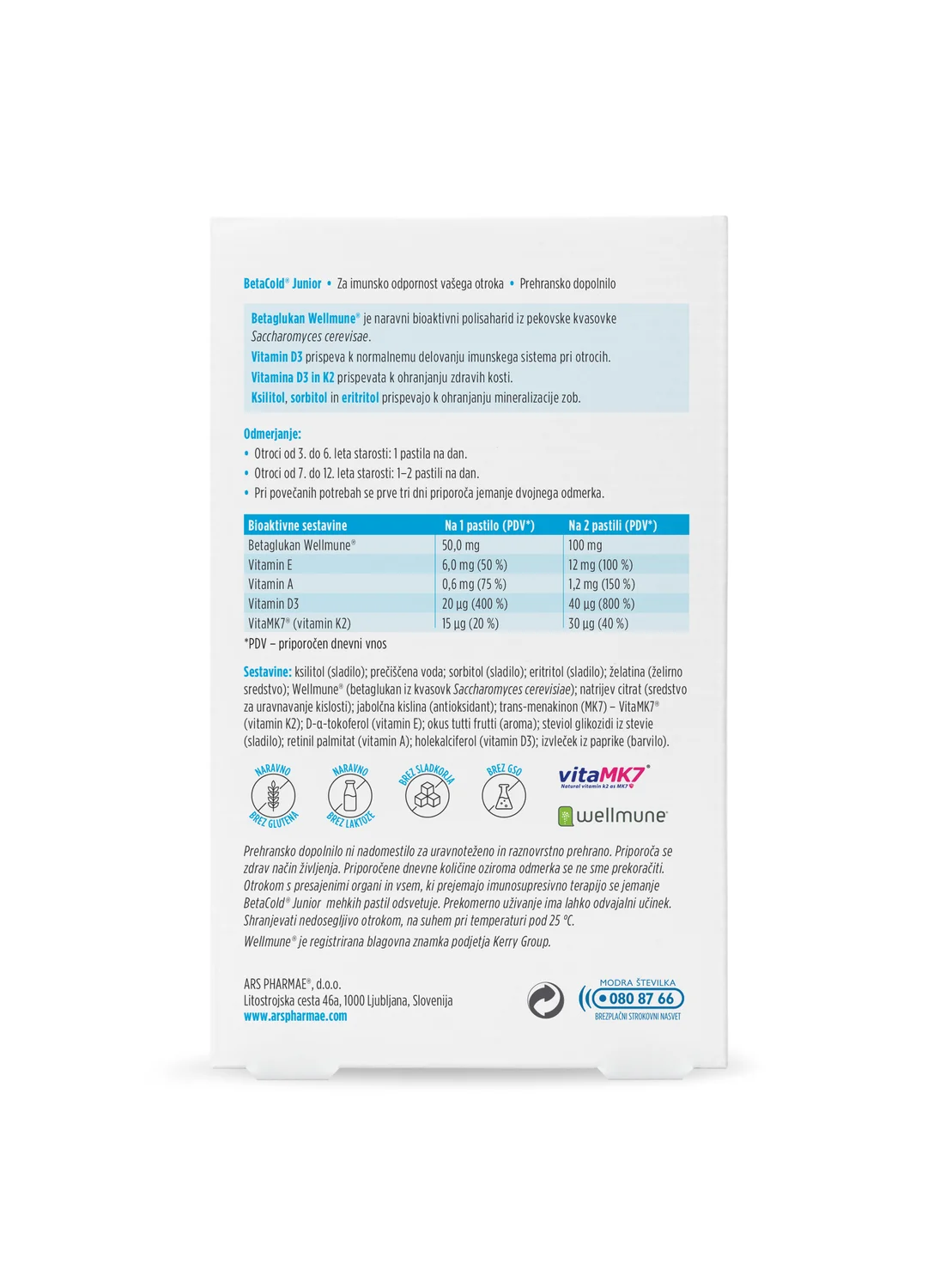BetaCold Junior so mehke pastile, posebej oblikovane za otroke, ki podpirajo njihov imunski sistem. Vsebujejo klinično preizkušen Wellmune beta-glukan, ki je naravni polisaharid, pridobljen iz pekovske kvasovke. Pastile so primerne za otroke od 2. leta starosti naprej in so zasnovane tako, da poleg imunskega sistema prispevajo tudi k zdravju zob in kosti. Ne vsebujejo glutena, laktoze, GSO, umetnih barvil in arom, kar jih dela primernih tudi za sladkorne bolnike.
