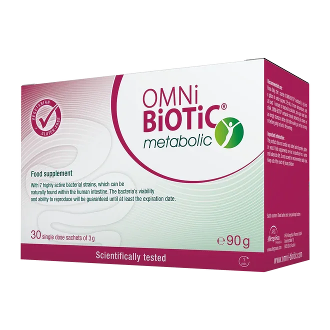 Omni-Biotic Metabolic je prehransko dopolnilo z visokoaktivnimi črevesnimi simbiozami. Vsaka vrečka vsebuje 7 posebej izbranih bakterijskih sevov s skupno 3 milijardami bakterij. Izdelek ne vsebuje živalskih proteinov, glutena in kvasa.