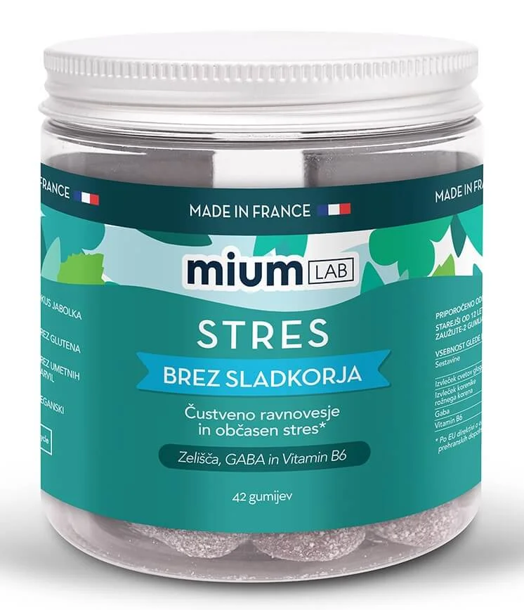 Mium Lab Stres gumiji so prehransko dopolnilo v obliki gumijev s prijetnim okusom jabolka, namenjeni podpori čustvenemu ravnovesju v obdobjih občasnega stresa. Formula združuje zelišča, GABA in vitamin B6 ter je zasnovana za vsakodnevno uporabo pri odraslih, ki želijo podporo živčnemu sistemu. Gumiji so brez sladkorja, brez glutena, brez umetnih barvil in primerni za vegane, zato predstavljajo priročno in prijetno obliko dopolnjevanja prehrane.