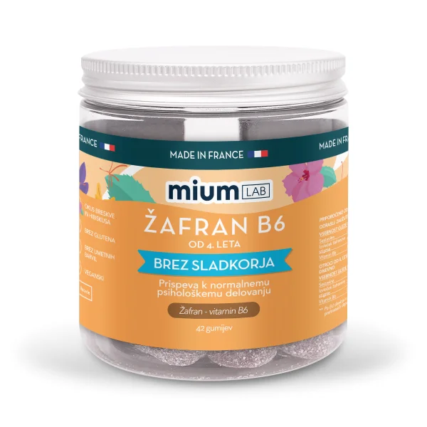 Mium Lab Žafran B6 je prehransko dopolnilo v obliki gumijev brez sladkorja s prijetnim okusom breskve in hibiskusa, namenjeno podpori normalnega psihološkega delovanja. Prehransko dopolnilo vsebuje žafran in vitamin B6 ter je primerno za odrasle in otroke od 4. leta dalje. Izdelek je veganski, brez glutena in brez umetnih barvil.