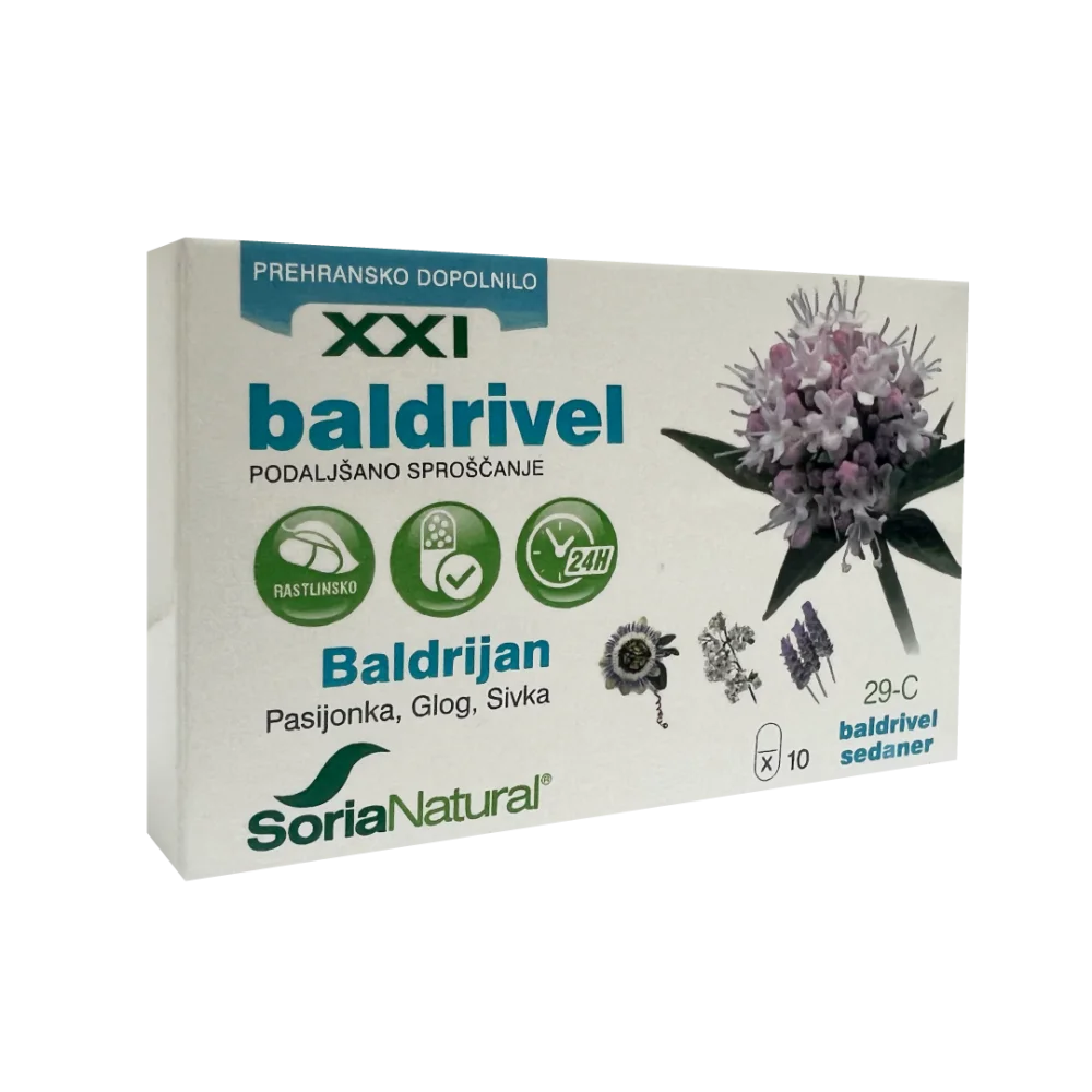 Soria Natural Baldrivel XXI kapsule s podaljšanim sproščanjem so prehransko dopolnilo z baldrijanom in pasijonko. Naravna kombinacija pomaga zmanjšati občutek napetosti in stresa ter pripomore k bolj kakovostnemu spancu. Podaljšano sproščanje omogoča manj pogosto jemanje, saj se aktivne snovi sproščajo postopoma.