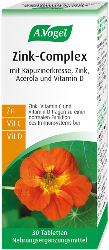A.Vogel Zink Complex vsebuje kombinacijo naravnih sestavin: cink, vitamin C iz acerole, vitamin D3 iz lišajev in kapucinko, ki skupaj prispevajo k normalnemu delovanju imunskega sistema, izboljšujejo počutju in pomagajo zmanjšati utrujenost.