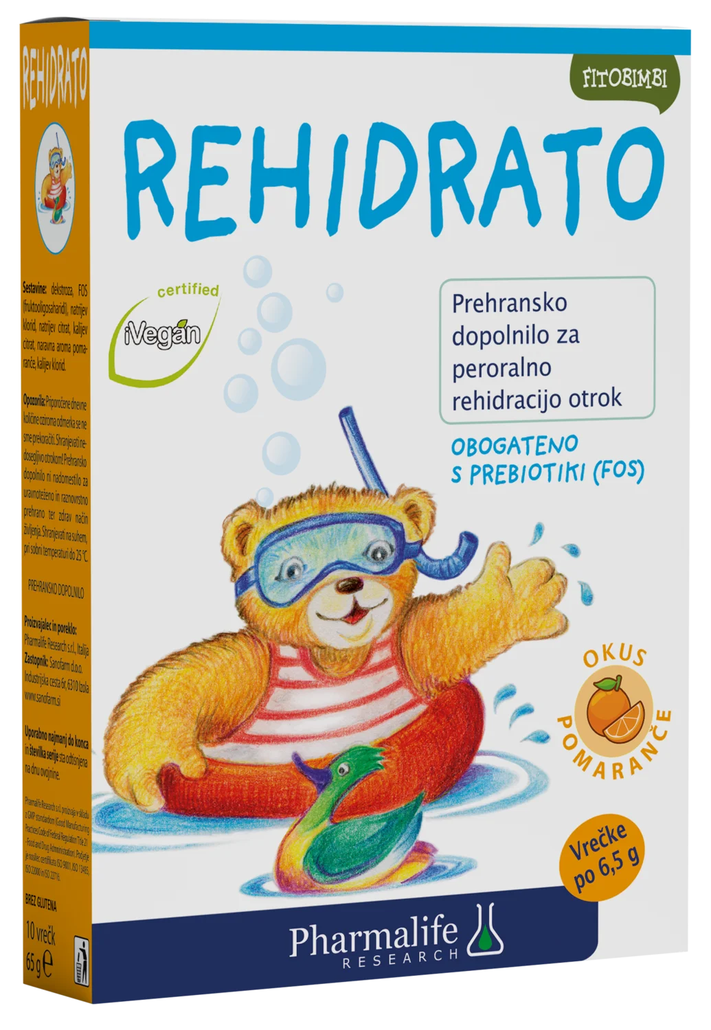 Peroralni prašek za rehidracijsko raztopino Fitobimbi Rehidrato je mešanica soli, elektrolitov in sladkorjev. Namenjena je nadomeščanju izgubljene tekočine in elektrolitov in za pomoč pri vzdrževanju hidriranosti telesa. Raztopina prispeva k ohranjanju vzdržljivosti pri daljših telesnih naporih in nadomešča izgubljene tekočine. S prijetnim okusom pomaranče. Primerno že od 6.meseca dalje.