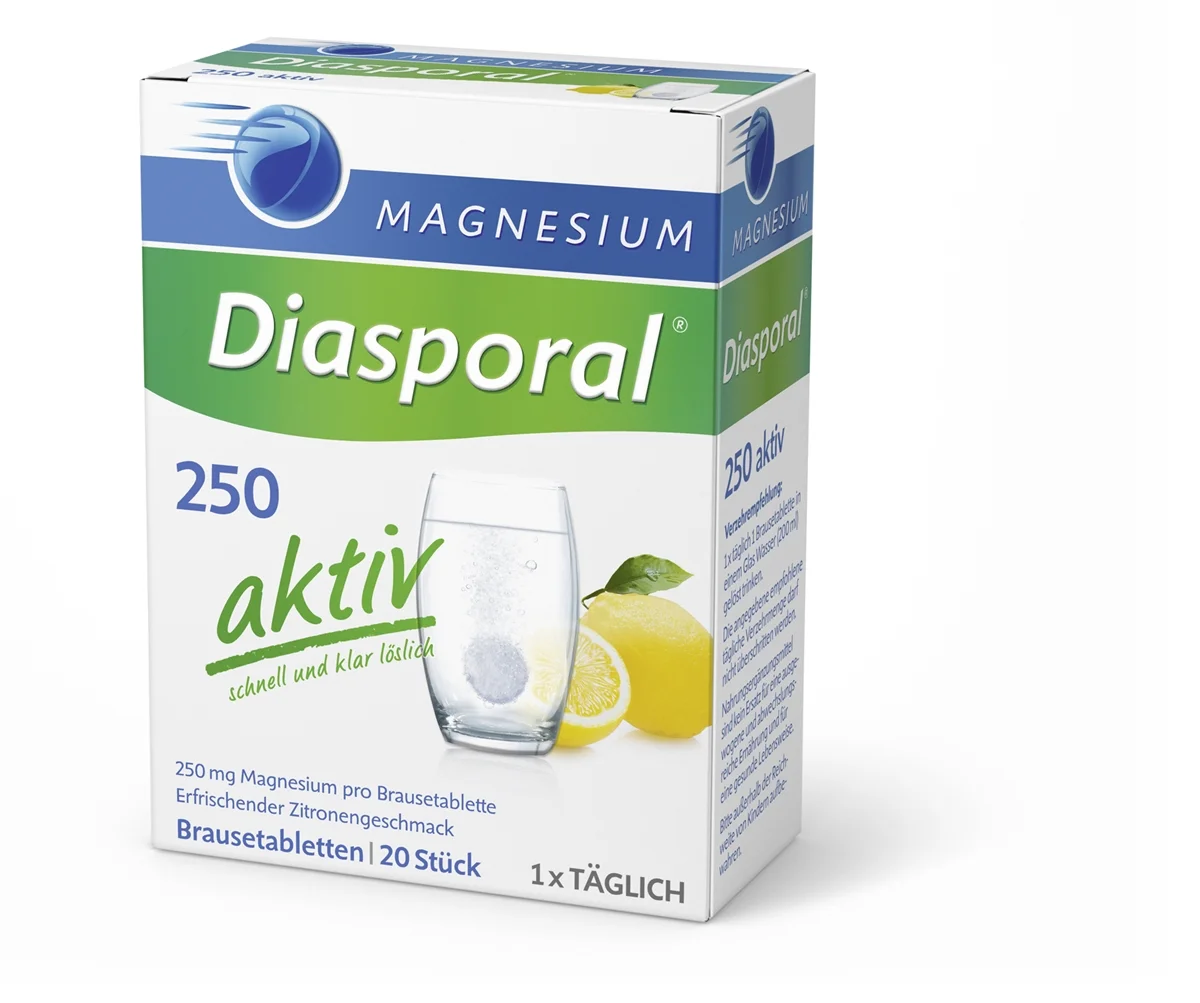 Magnesium Diasporal 250 Aktiv je prehransko dopolnilo v obliki šumečih tablet z osvežilnim okusom limone, ki omogoča enostavno pripravo napitka z magnezijem. Izdelek je primeren za vse, ki želijo enostavno podpreti normalno delovanje mišic in živčnega sistema ter splošno dobro počutje, še posebej ob povečanih potrebah po tekočini.