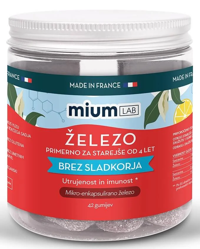 Mium Lab Železo gumiji so prehransko dopolnilo v obliki gumijev s prijetnim okusom yuzuja in rdečega sadja, namenjeno otrokom od 4. leta dalje in odraslim. Izdelek je zasnovan kot prijeten način dopolnjevanja prehrane, zlasti v obdobjih utrujenosti in povečane obremenitve imunskega sistema. Gumiji so brez sladkorja, brez umetnih barvil, brez glutena in primerni za vegane.