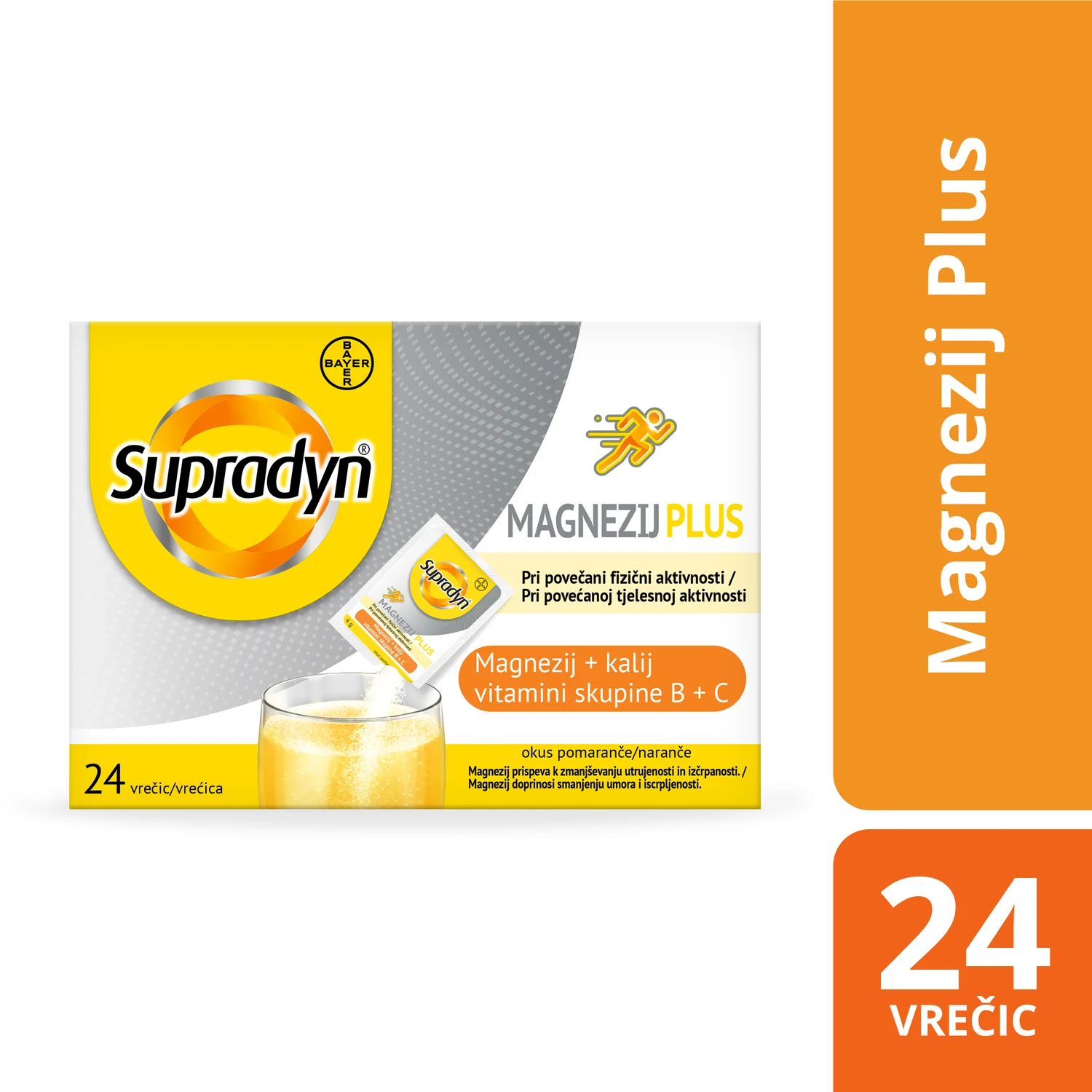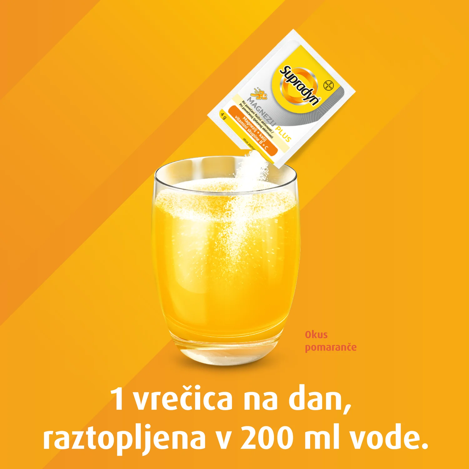 Supradyn Magnezij Plus je prehransko dopolnilo z magnezijem, kalijem in vitamini, s sladilom, v obliki šumečih zrnc.