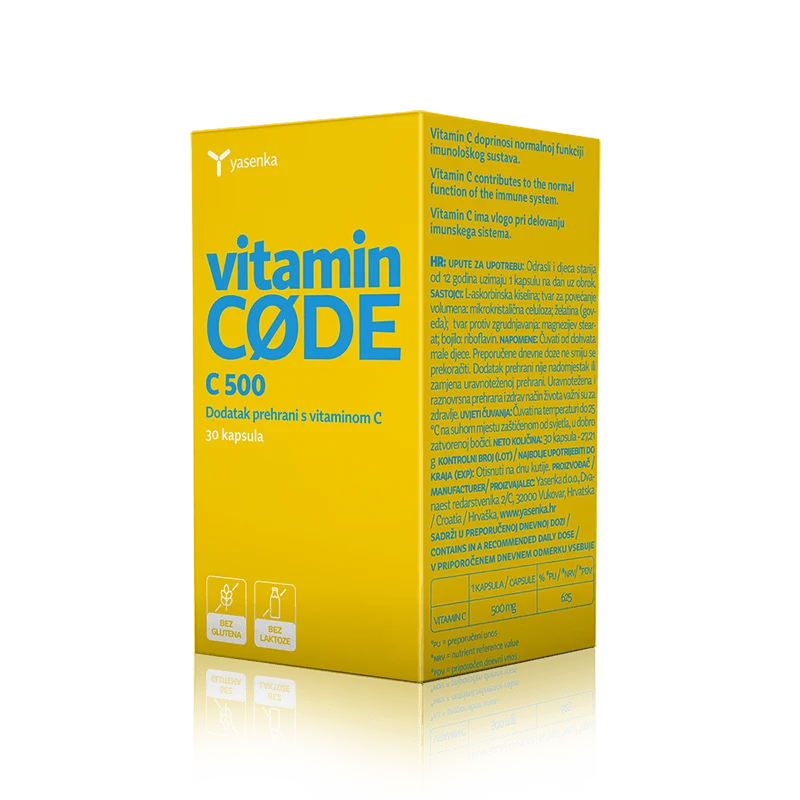 Yasenka Vitamin Code C 500 je prehransko dopolnilo v kapsulah, ki prispeva k normalnemu delovanju imunskega sistema in ščiti celic pred oksidativnim stresom.