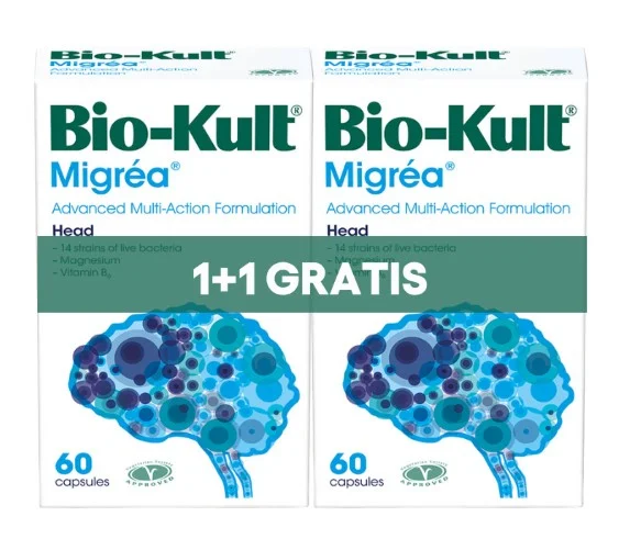 - Probiotične bakterije v Bio-Kult Migrea so ključne za ravnovesje črevesne flore, kar ima pozitiven vpliv na prebavni sistem, pa tudi na splošno dobro počutje, saj so črevesja tesno povezana z zdravjem možganov. Ustrezna črevesna flora pomaga zmanjšati vnetja in izboljša absorpcijo hranil, kar posledično pripomore k boljši energiji in manjši utrujenosti.