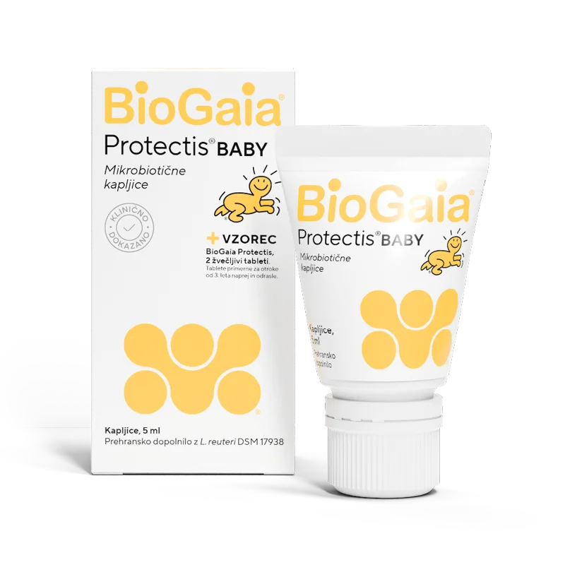 BioGaia Protectis Baby kapljice so prehransko dopolnilo za varno, preprosto in učinkovito vzdrževanje ustrezne koncentracije mikrobiote v črevesju. Primerne so za dojenčke in majhne otroke ali tiste, ki ne morejo ali še ne znajo žvečiti tablet.