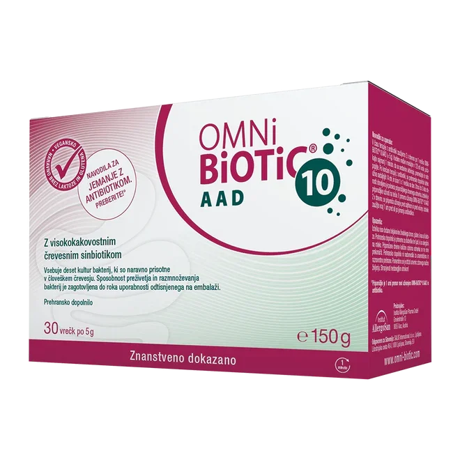 Omni-Biotic 10 AAD prašek v vrečkah je prehransko dopolnilo, namenjeno podpori črevesne mikrobiote v času antibiotične terapije. Primeren je tudi za diabetike in ljudi, ki so alegični na mleko.