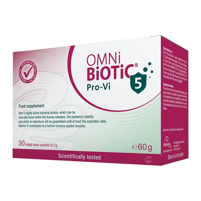 Omni-Biotic Pro-Vi 5 prašek v vrečkah je prehransko dopolnilo, namenjeno podpori zdrave črevesne flore in imuskemu sistemu, še posebaj v obdobjih stresa, izpostavljenosti virusom ali drugim patogenom ter v hladnejših mesecih ali ob nezdravemu načinu življenja. Primeren je tudi za otroke, diabetike, nosečnice in doječe matere ter za osebe, ki so alergične na mleko.