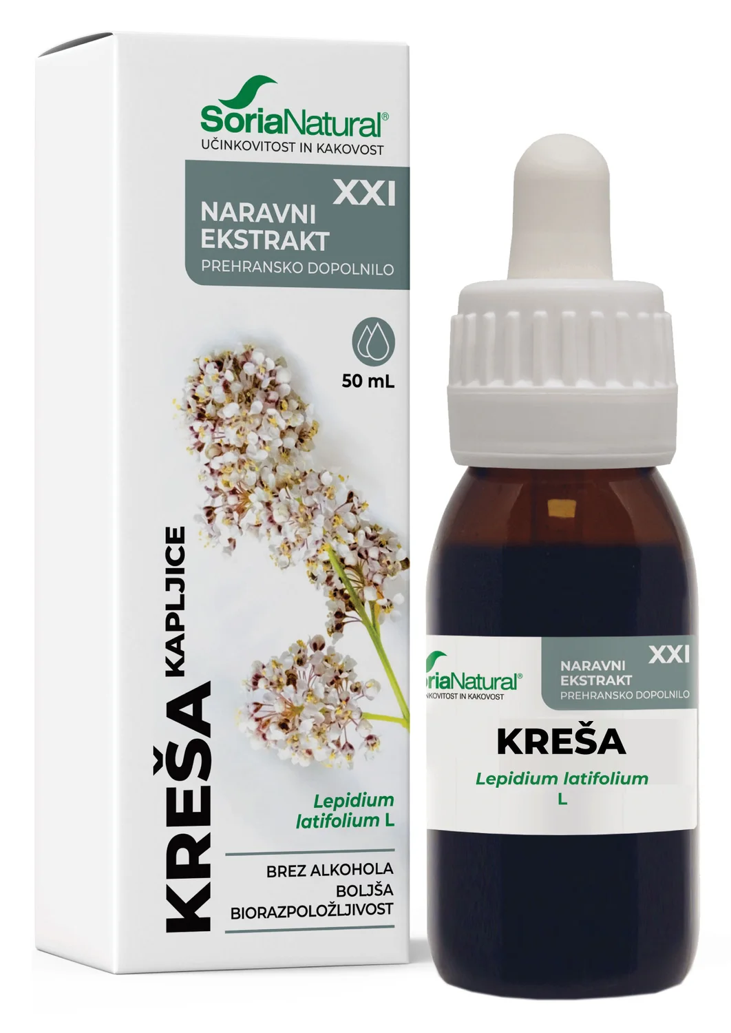 Soria Natural Kreša XXI kapljice so prehransko dopolnilo z izvlečkom kreše, ki se tradicionalno uporablja za podporo sečilom in pri vnetju prostate. Izboljšana formulacija omogoča boljšo absorpcijo in biološko uporabnost kot trdne oblike, kar poveča učinkovitost. Primerne so za uporabo pri odraslih in starostnikih.