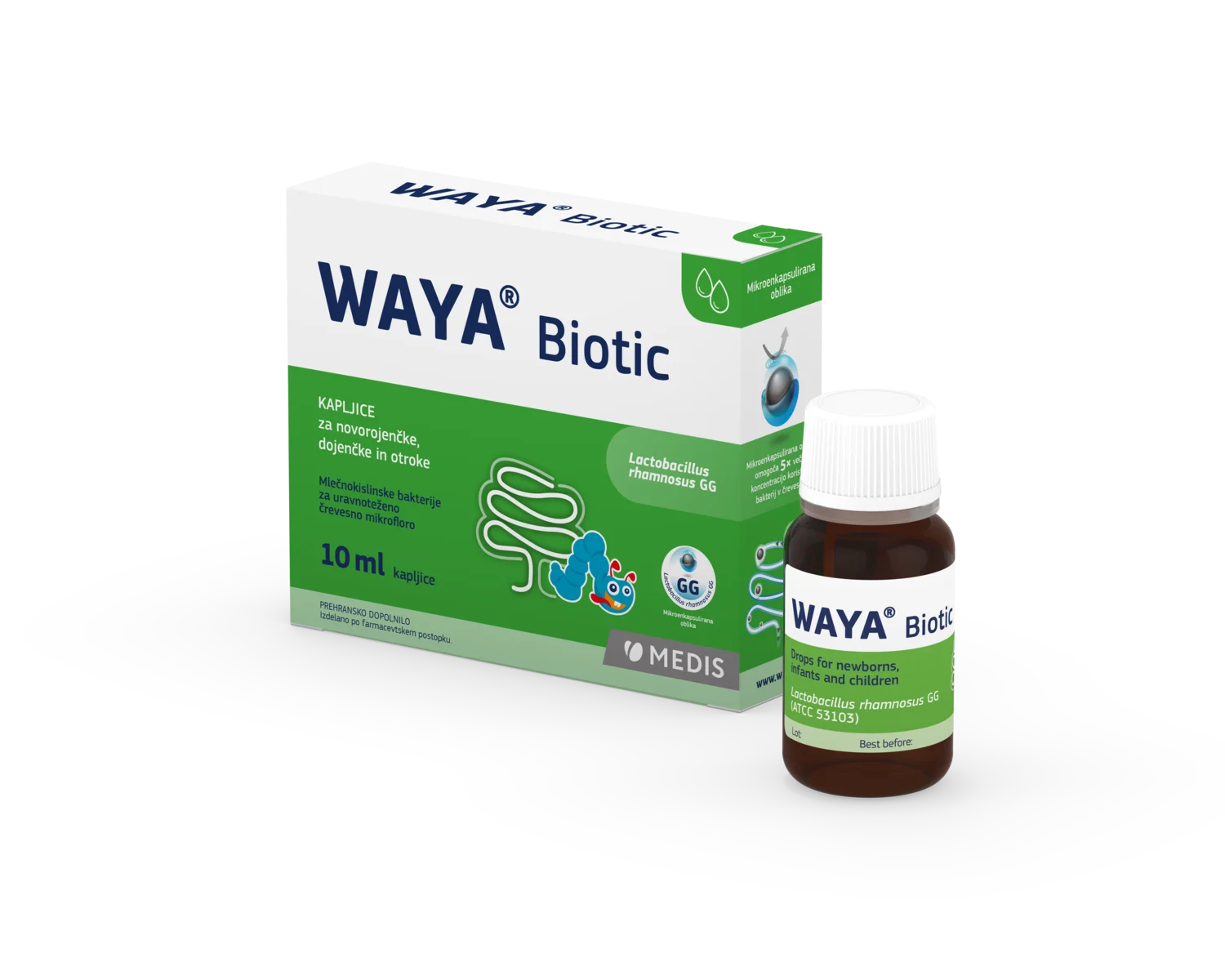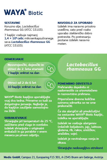 WAYA Biotic kapljice za novorojenčke, dojenčke in otroke so prehransko dopolnilo, ki pripomore k ohranjanju ravnovesja črevesne mikroflore. Vsebujejo skrbno izbrano in temeljito raziskano koristno mlečnokislinsko bakterijo Lactobacillus rhamnosus GG, ki je naravno prisotna tudi v prebavnem sistemu ljudi. Sedem (7) kapljic vsebuje najmanj 1,4 milijarde celic mikroenkapsulirane koristne bakterije Lactobacillus rhamnosus GG.