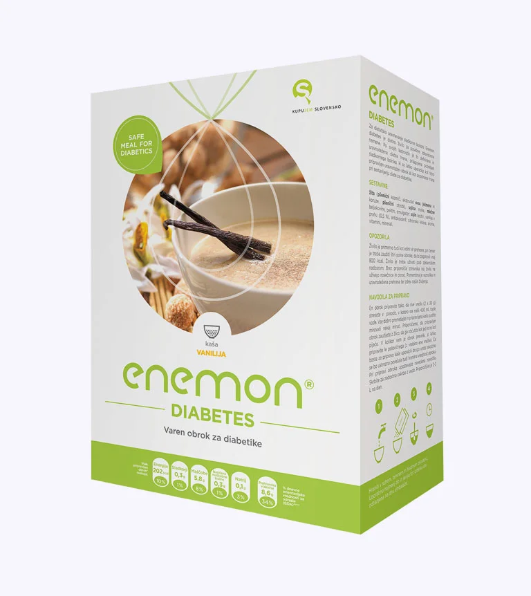 Enemon Diabetes je dietno živilo za posebne zdravstvene namene, prilagojeno potrebam sladkornih bolnikov, in ugodno vpliva na njihovo presnovo. Žitna kaša ima visoko vsebnost beljakovin in prehranskih vlaknin ter ne vsebuje dodanih sladkorjev.