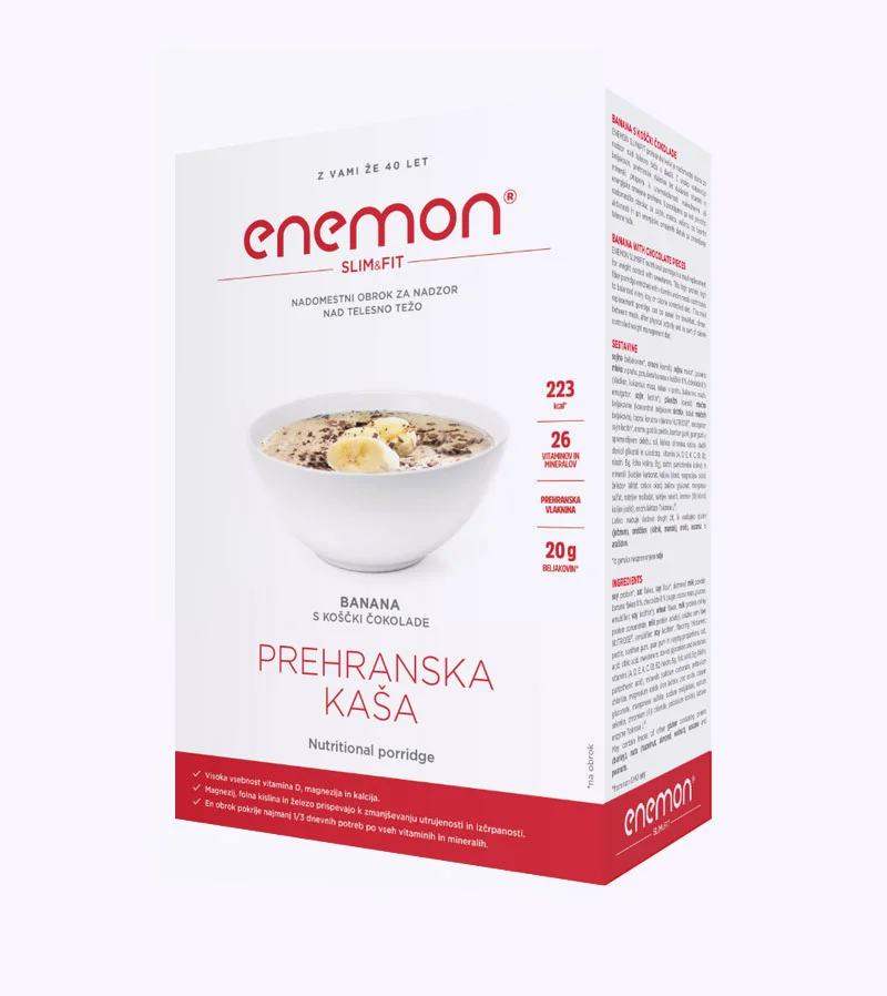 - Za zniževanje ali vzdrževanje telesne teže - za zniževanje teže nadomestite 2 obroka na dan z Enemon Slim, za vzdrževanje pa zadostuje 1 nadomestni obrok (priporočljivo zajtrk ali večerja)