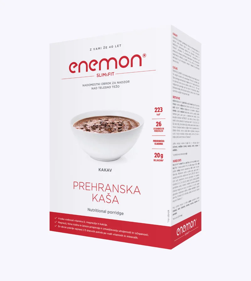 - Za zniževanje ali vzdrževanje telesne teže - za zniževanje teže nadomestite 2 obroka na dan z Enemon Slim, za vzdrževanje pa zadostuje 1 nadomestni obrok (priporočljivo zajtrk ali večerja)