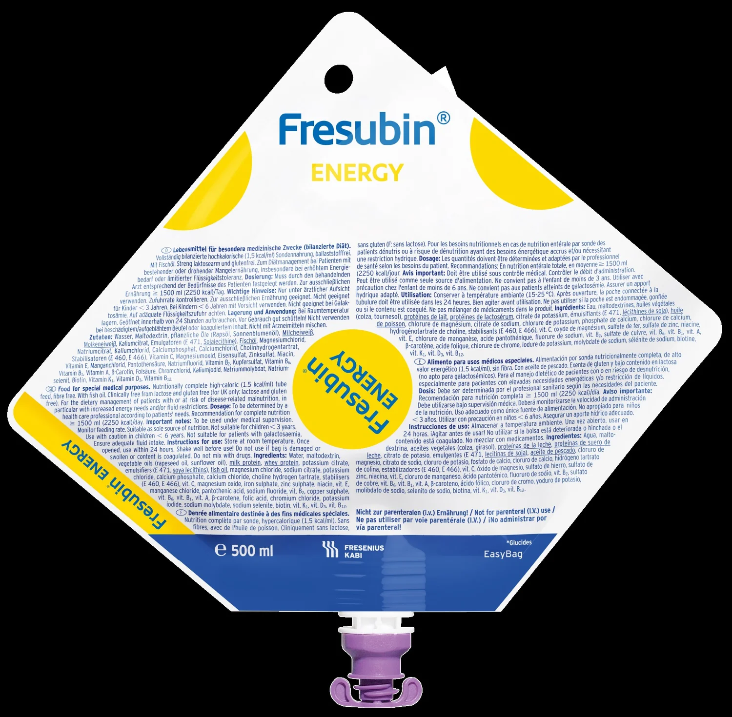 Fresubin Energy je prehransko popolna, visokokalorična (1,5 kcal/ml) tekoča hrana za posebne zdravstvene namene, namenjena uporabi po sondi. Uporablja se za dietetsko uravnavanje prehrane pri bolnikih z obstoječo ali grozečo podhranjenostjo, zlasti pri povečanih energijskih potrebah in/ali omejenem vnosu tekočine. Izdelek ne vsebuje vlaknin, je brez glutena, vsebuje ribje olje in zelo malo laktoze.
