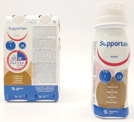 Supportan Drink je visokokaloričen (1,5 kcal/ml) dietetični napitek za posebne zdravstvene namene. Uporablja se za dietetsko uravnavanje prehrane onkoloških bolnikov, bolnikov s kroničnimi katabolnimi boleznimi in/ali kaheksijo ter bolnikov z motnjami hranjenja ali z grozečo oziroma obstoječo podhranjenostjo, predvsem pri povečanih potrebah po energiji in beljakovinah. Izdelek vsebuje ribje olje (EPA + DHA), beljakovine in maščobe, vključno z MCT. Je brez glutena, vsebuje malo laktoze in malo natrija ter vsebuje kofein (0,34 mg/100 ml).