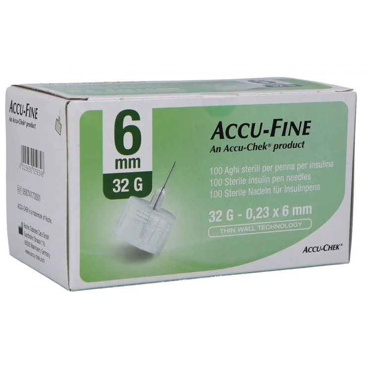 Accu-Fine igle so visokokakovosten medicinski pripomoček, zasnovan za enkratno uporabo z injekcijskimi peresniki, namenjenimi za subkutano injiciranje inzulina in drugih zdravil. Igle so na voljo v več različnih dimenzijah, kar omogoča prilagoditev potrebam uporabnika. Vsak paket vsebuje 100 sterilnih igel, katerih konica je zasnovana za enostavno in nežno vstavljanje v kožo. Specializirana prevleka omogoča gladko drsenje igle skozi kožo, medtem ko tanka stena igle zagotavlja hitrejši pretok insulina. Igle so združljive z vsemi običajnimi inzulinskimi peresniki in primerne za uporabnike vseh starosti in telesnih tipov.