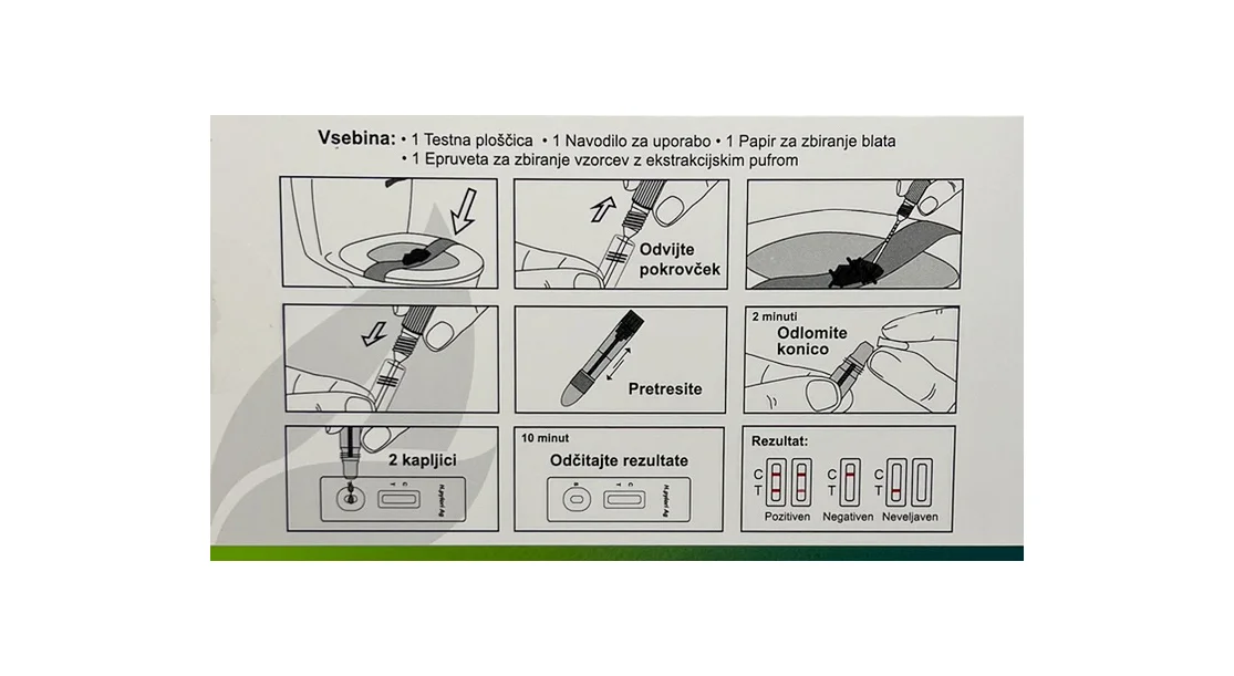 - Pri odčitavanju preverite kontrolno črto, ki potrjuje pravilno izvedbo testa.