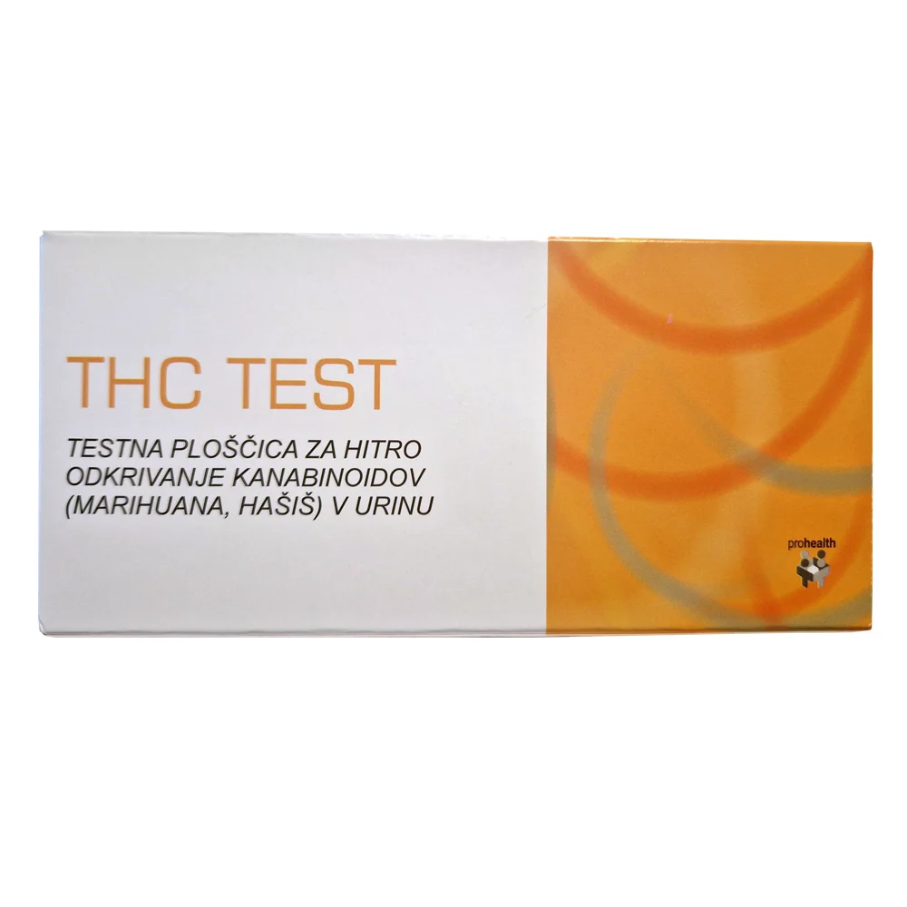 - THC Test testna ploščica je hitri, enostopenjski test za odkrivanje prisotnosti THC v človeškem urinu v mejni koncentraciji 50 ng/ml. Rezultat testa prikaže samo kvalitativno, preliminarno oceno. Za potrditev rezultata analize uporabljajte alternativno kemijsko metodo. Priporoča se plinska kromatografija oziroma masna spektrometrija (GC/MS).