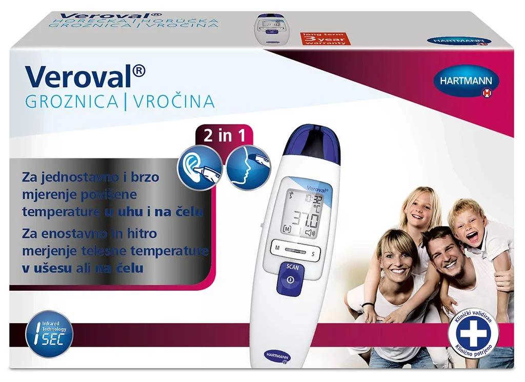 Veroval infrardeči termometer 2v1 je medicinski pripomoček za hitro in natančno merjenje telesne temperature na čelu ali v ušesu. Primeren je za otroke stare nad 6 mesecev in odrasle ter ima možnost higieničnega merjenja s priloženimi enkratnimi zaščitnimi pokrovčki.