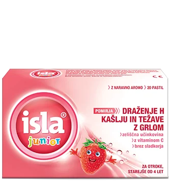 Isla Junior pastile z okusom jagode ščitijo suho in razdraženo sluznico ust in žrela ter lajšajo značilne težave, povezane s prehladom in vnetim grlom. So mehke, okusne pastile brez dodanega sladkorja. Medicinski pripomoček.