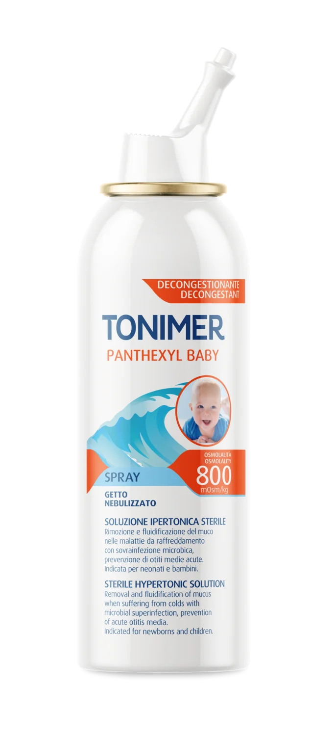Tonimer Panthexyl Baby je sterilna hipertonična raztopina morske vode s ksilitolom in pantenolom, namenjena odstranjevanju in utekočinjanju sluzi v nosnih poteh. Primerna je za novorojenčke, dojenčke in otroke, posebej ob prehladih ali vnetjih zgornjih dihal. Ne vsebuje konzervansov in potisnega plina v stiku s tekočino, zato je varna za občutljive otroške sluznice.