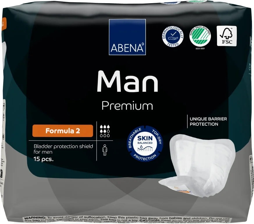 Abena Man Premium Formula 2 so anatomsko oblikovane in zanesljive zaščitne predloge za moške, namenjene uporabnikom z manjšimi do srednjimi težavami z nehotenim uhajanjem urina. Predloge se enostavno pritrdijo na spodnje perilo s samolepilnim trakom in so zasnovane za optimalno udobje ter diskretnost. Zračne in mehke, nudijo učinkovito zaščito pred iztekanjem. Oblikovane so v črko T, kar omogoča optimalno prileganje in diskretno nošenje. Predloge so dermatološko testirane.