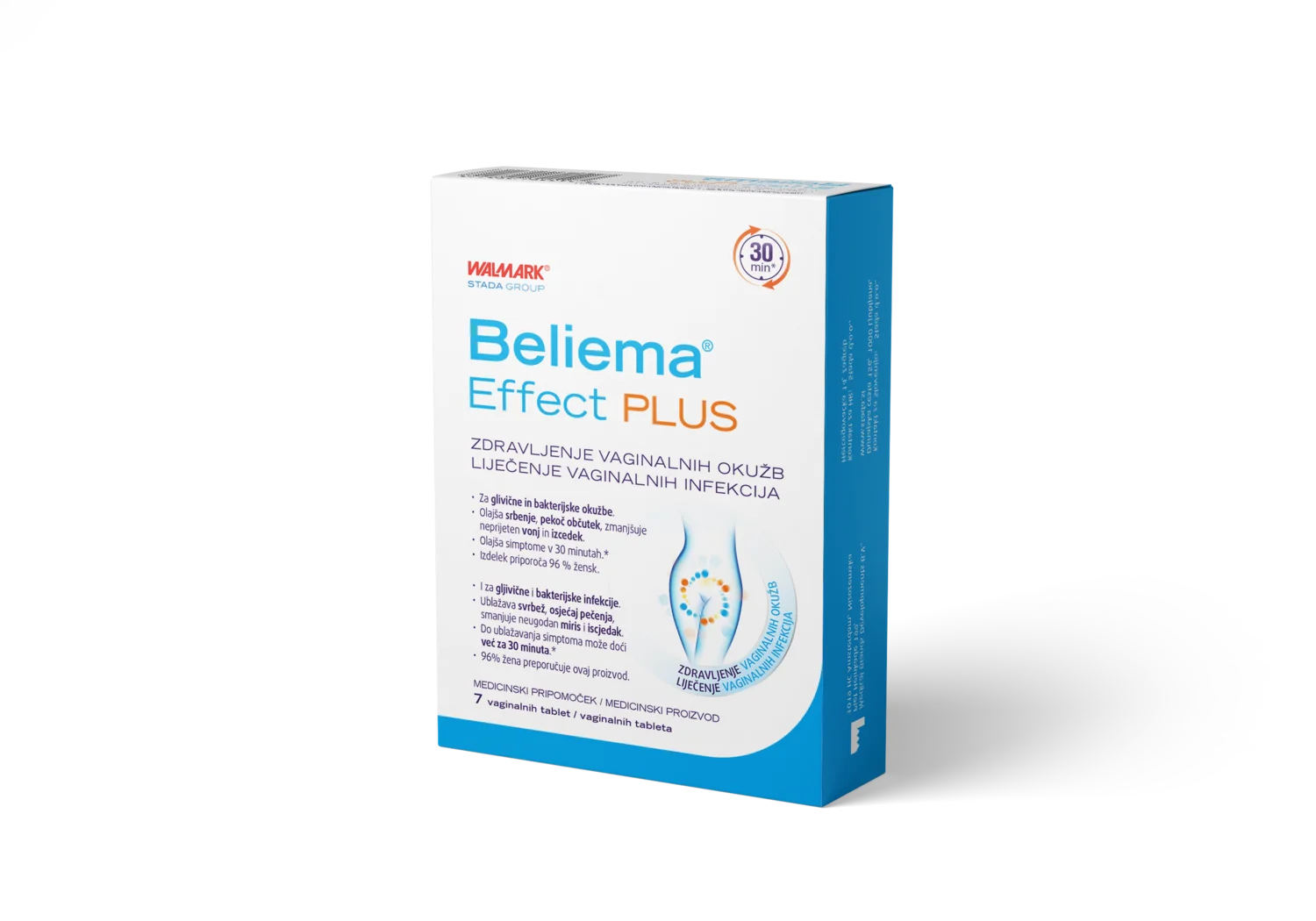 Beliema Effect Plus je inovativni medicinski pripomoček, ki je posebej zasnovan za samostojno uporabo pri ženskah, starejših od 16 let. Izdelek v obliki majhnih vaginalnih tablet temelji na dveh ključnih sestavinah – hialuronski kislini in laktitol monohidratu. Ti dve sestavini medsebojno sodelujete, da pomagata obnoviti ravnovesje vaginalne flore, uravnavata pH nožnice in odpravljata simptome vaginalnih okužb. Vaginalne tablete so namenjene zdravljenju okužb, ki jih povzročajo glivice, kot je Candida albicans, ter bakterije, kot je Gardnerella vaginalis. Poleg tega Beliema Effect Plus učinkovito zmanjšuje neprijetne simptome okužb, kot so srbenje, pekoč občutek, nenavaden izcedek in neprijeten vonj.